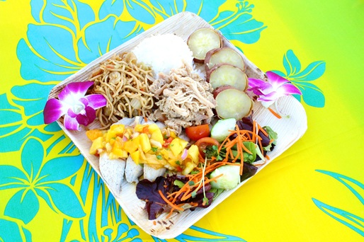 Kalua pork; Teriyaki chicken; Fresh island catch; Chow mein noodles; Steamed vegetables; Vegetarian curry. -